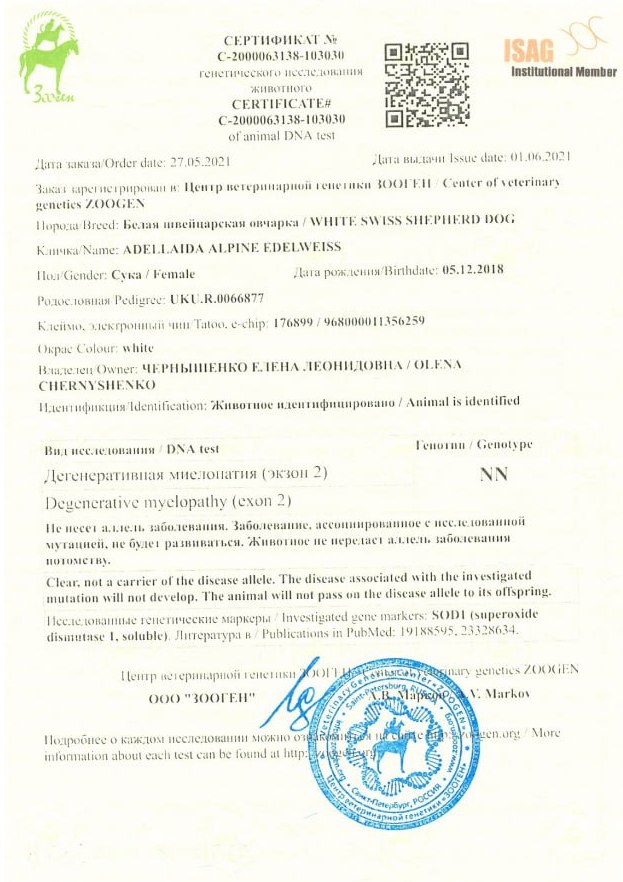 дегенеративная миелопатия DM - чиста, без носительства,
