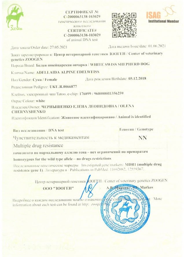 чувствительность к препаратам MDR1 - чиста, без носительства,