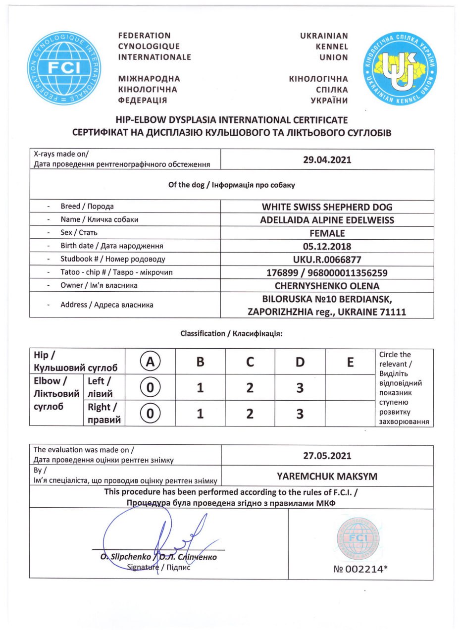 Свободен от дисплазии HD-АА, ED-00.