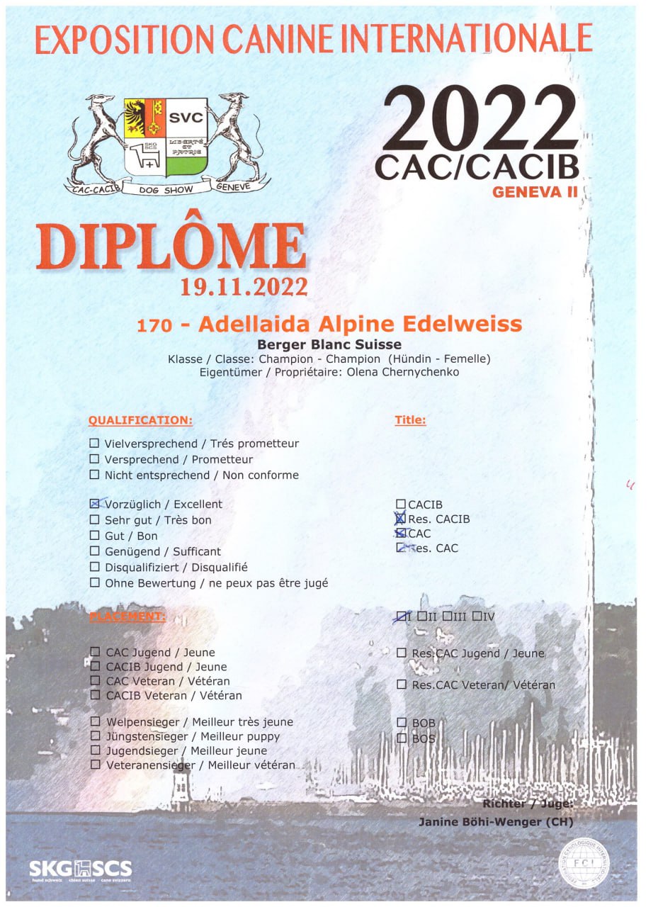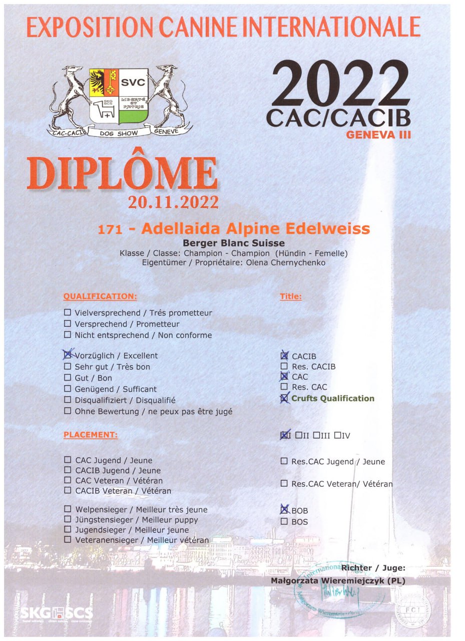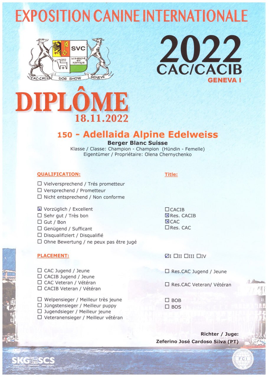 Unser Zwinger Alpine Edelweiss musste unser Zuhause in der besetzten Stadt Berdyansk in der Ukraine verlassen und wir sind nun vorübergehend in der Schweiz.Am 17. März hat unsere Adellaida Alpine Edelweiß sieben Welpen zur Welt gebracht, drei Jungen und vier Mädchen. Wir haben Papa von Welpen auf einer Hundeausstellung in Genf kennengelernt.Ice Angel of Dreams Dream Catcher "SAM" war der Sieger am ersten und zweiten Tag der Ausstellung unter den Weißen Schweizer Schäferhunden. Er hat den Titel des Interchampions и Multi-Champion des Landes. Adellaida Alpine Edelweiss gewann den dritten Tag. Unsere Treffen war kein Zufall und jetzt haben wir wunderschöne Welpen.
